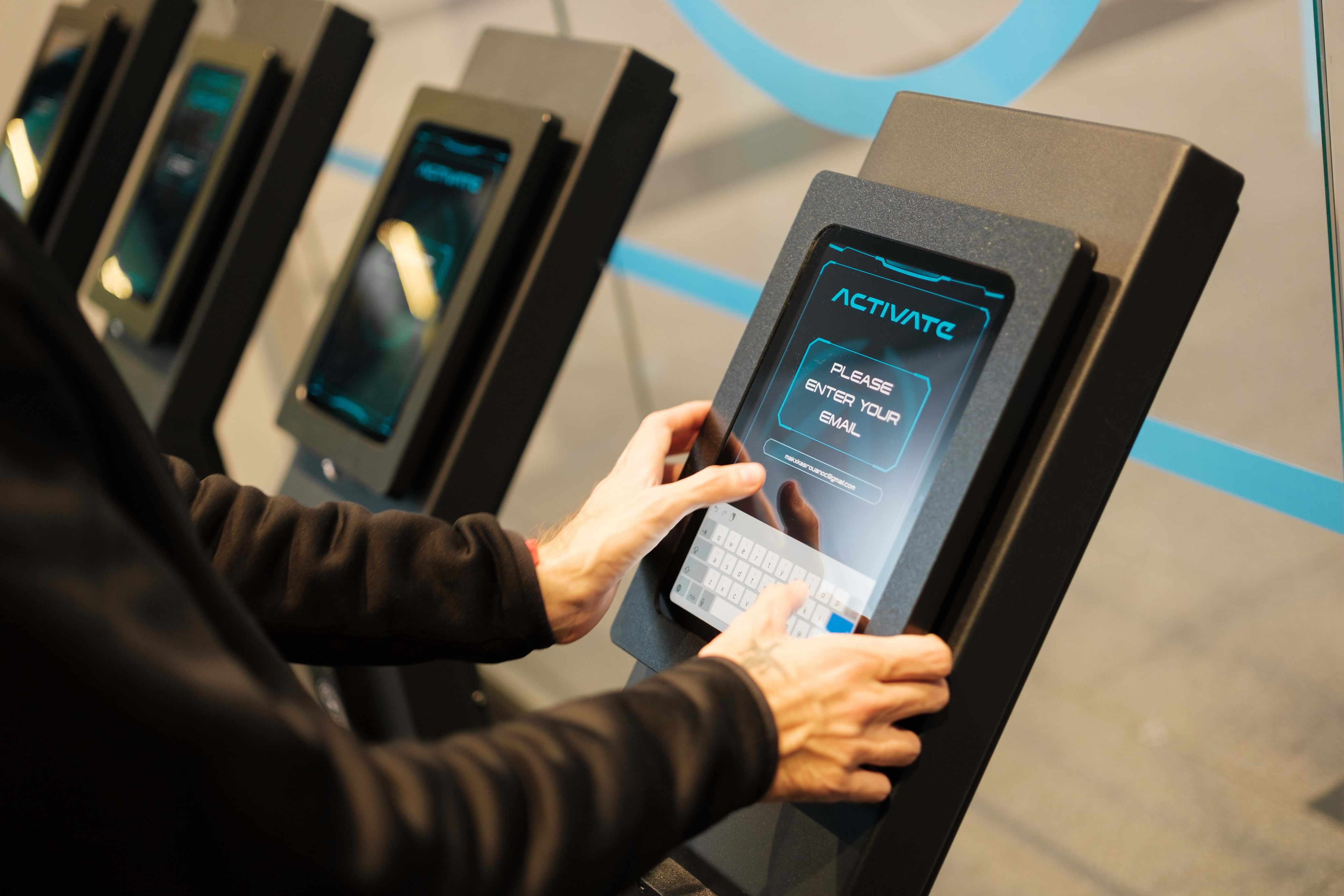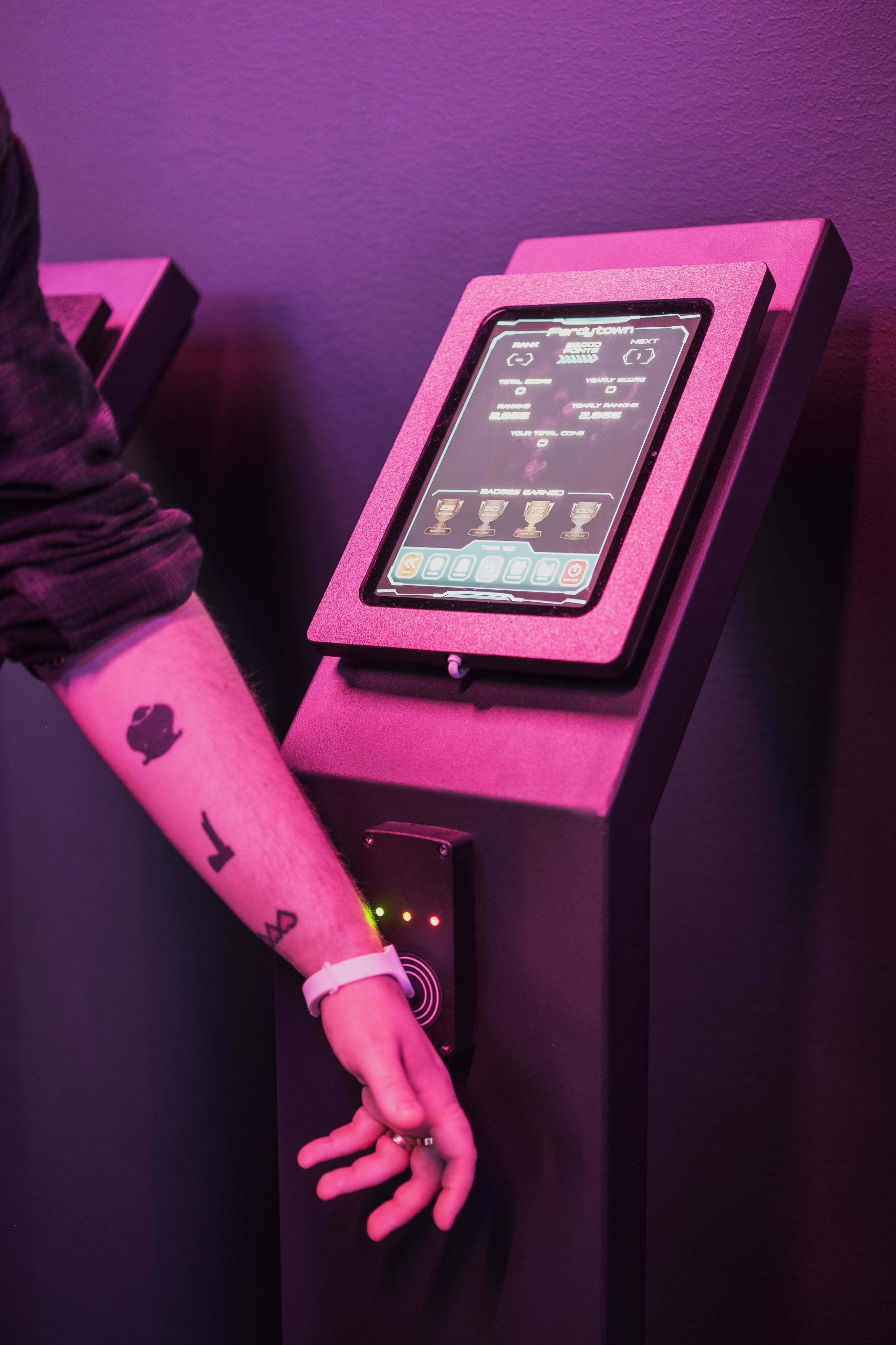 The gaming time is 60 minutes and when you play you get “coins”. Your points and level are saved in a personal profile which is connected to a bracelet you wear when you're playing.
