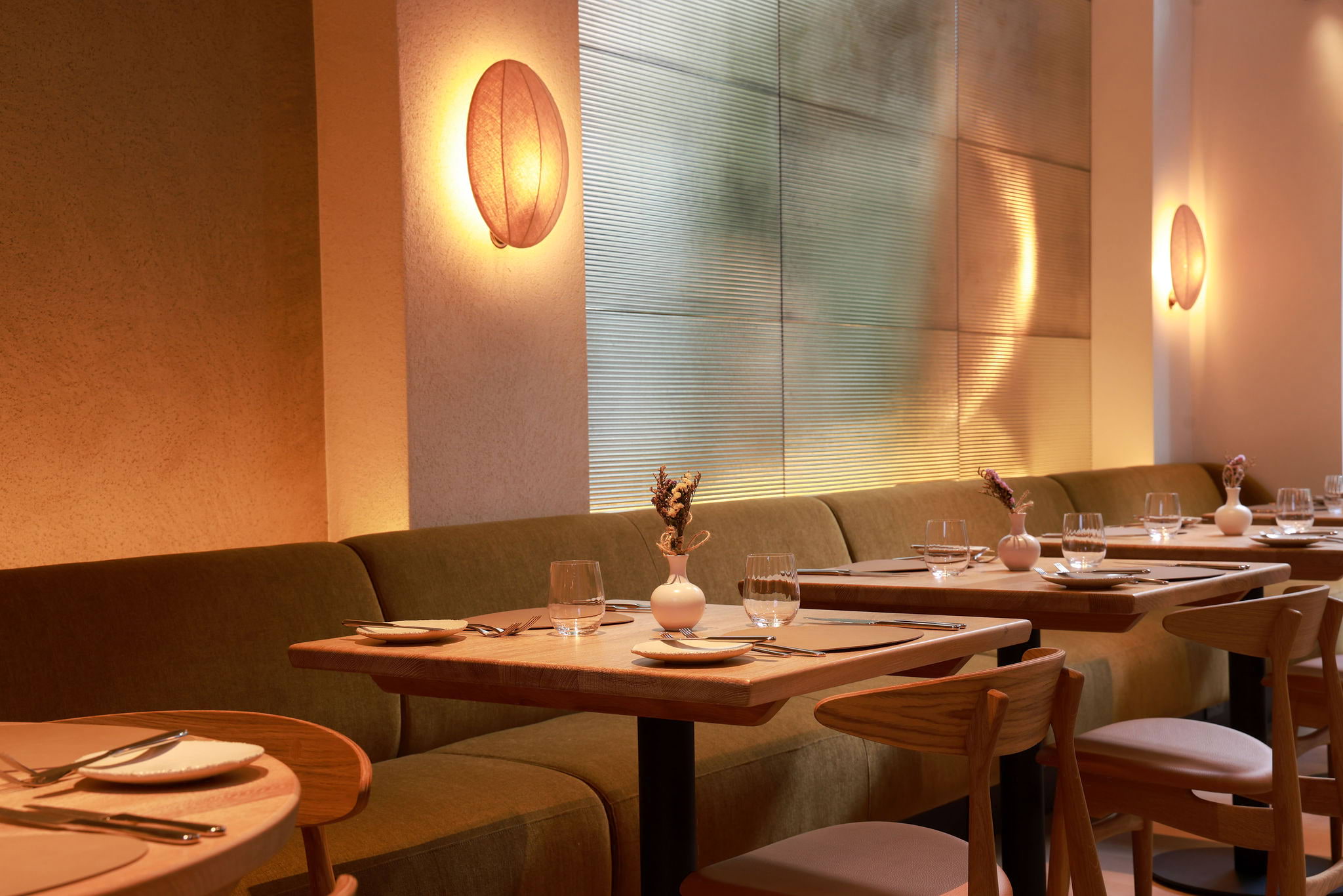 The old Mere site has been reworked into a calm space with warm wood, soft tones and huge windows that flood the space with light. The bar level pairs curved seating and mellow lighting with an elegant marble bar, and the dining room below follows the same palette of oaky textures and clean lines. Ample natural light and a subtle jazz soundtrack help keep everything laid back.