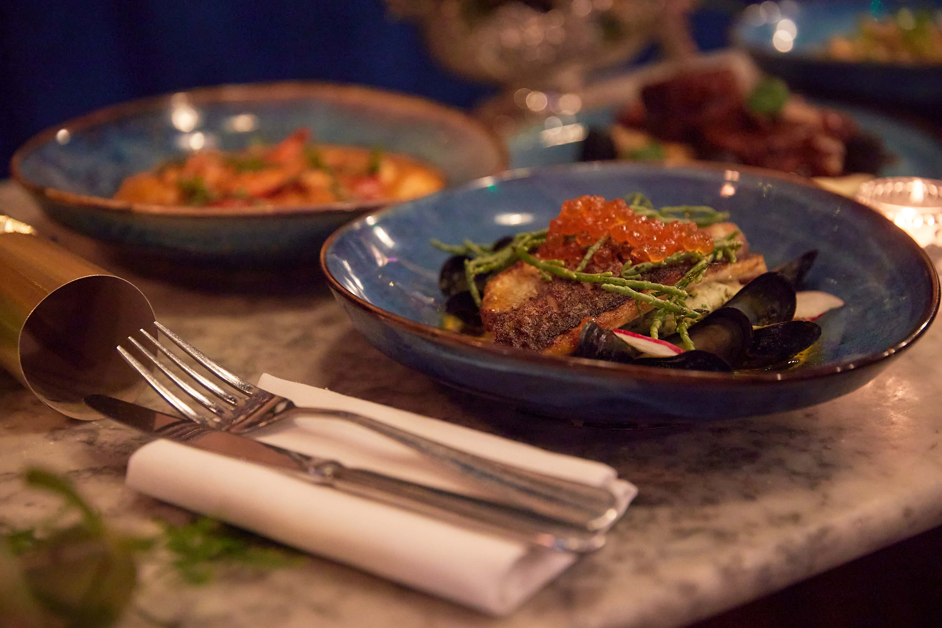 Agrodolce London champions Roman-style cuisine, serving dishes like pinsas, bruschette, and steaks in a grand dining room with chandeliers, marble tables, and framed artwork. This Christmas, they're serving a four-course festive menu featuring dishes like beef tartare with truffle-infused cheese sauce, tonnarelli pasta with clams, and oven-baked sea bass. With a bottle of wine for every four guests included in the price, it's a great choice for intimate and larger Christmas dinners alike.