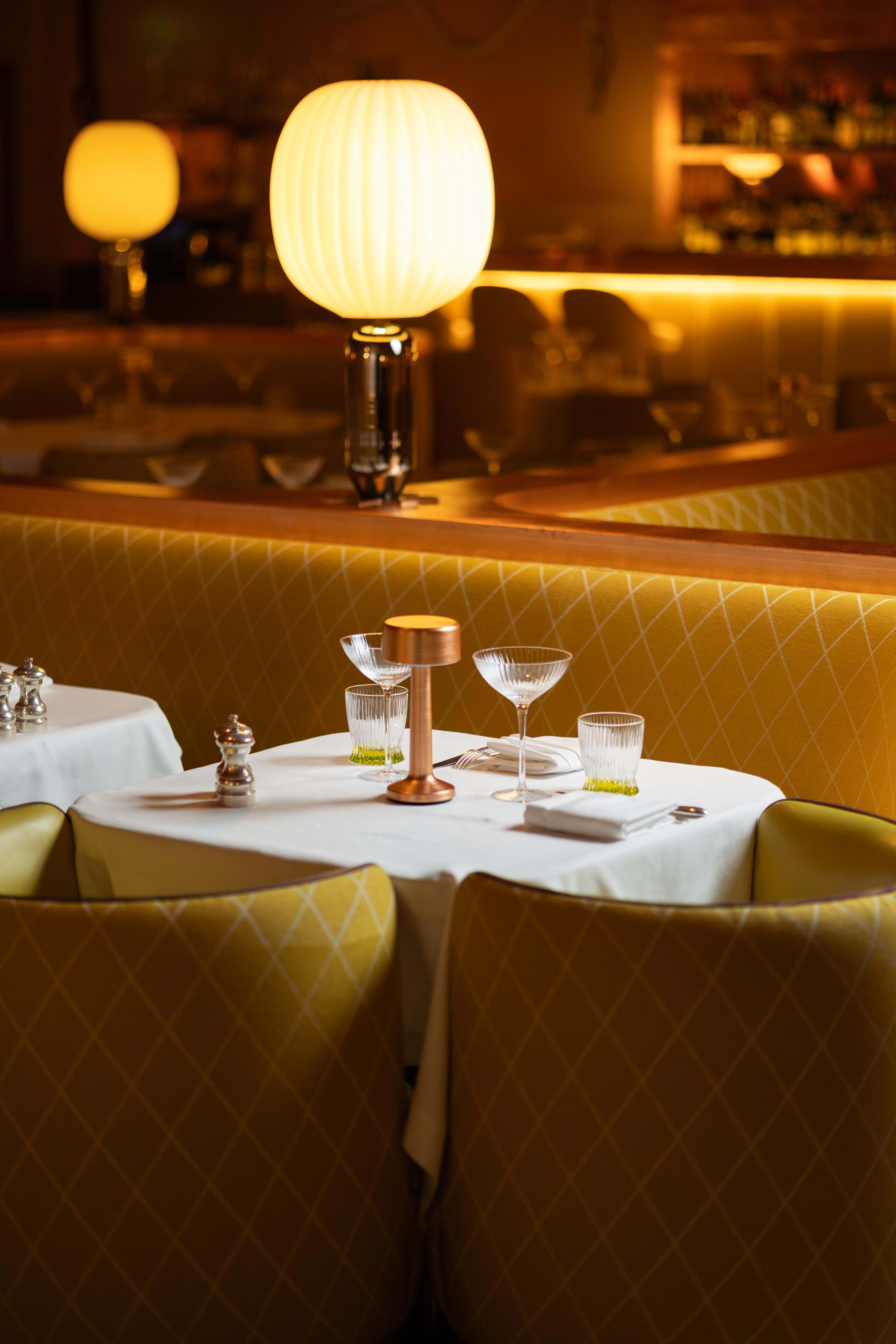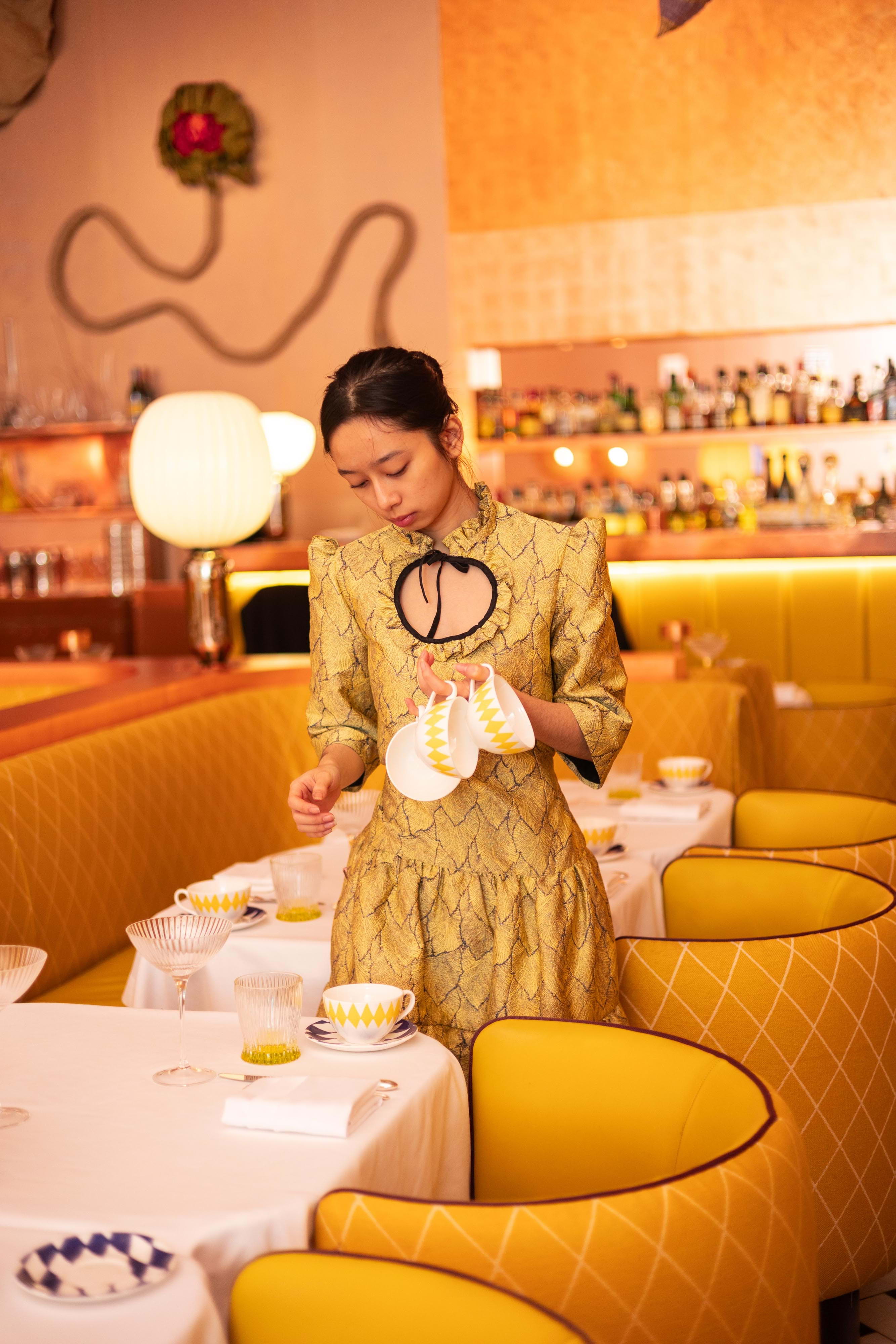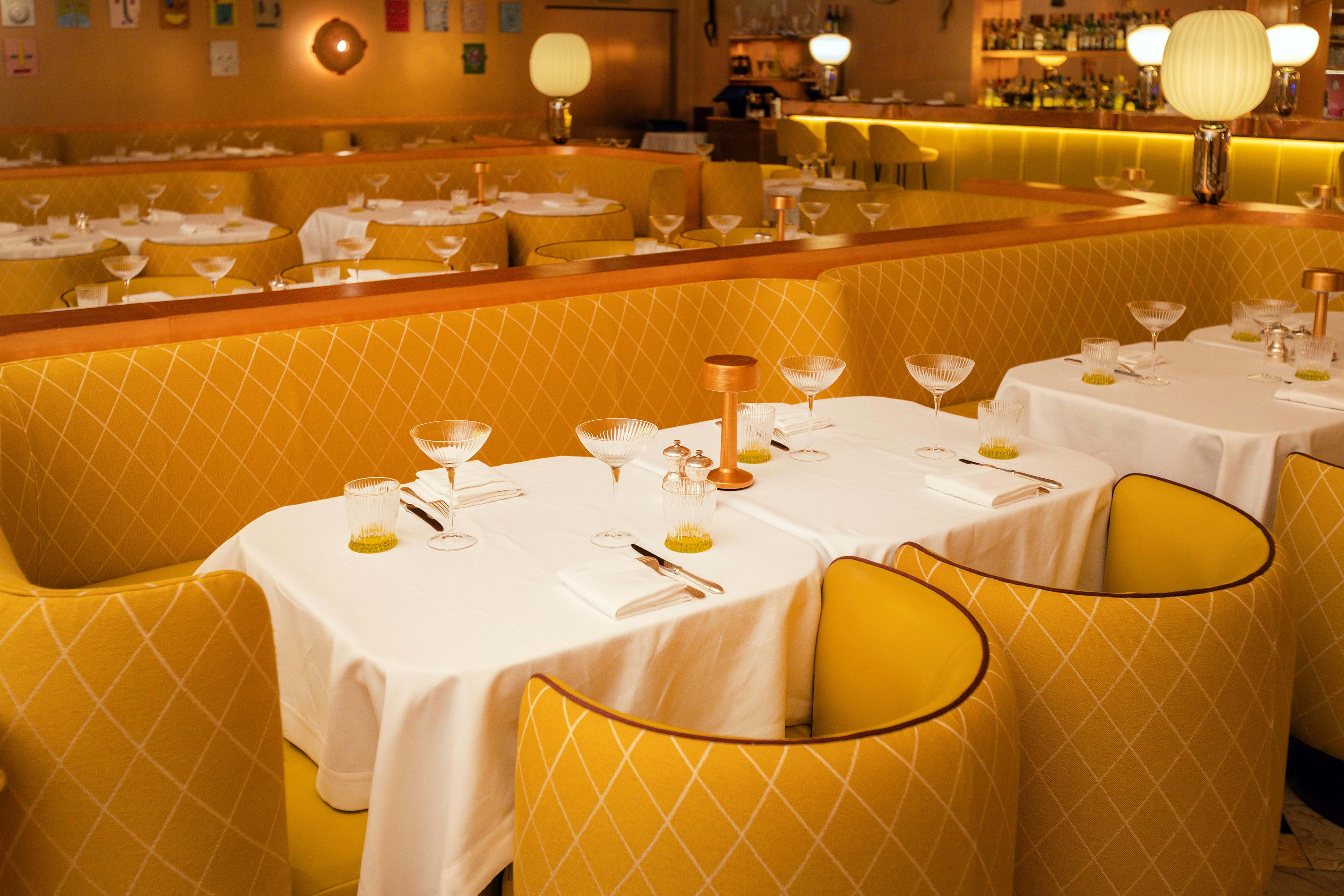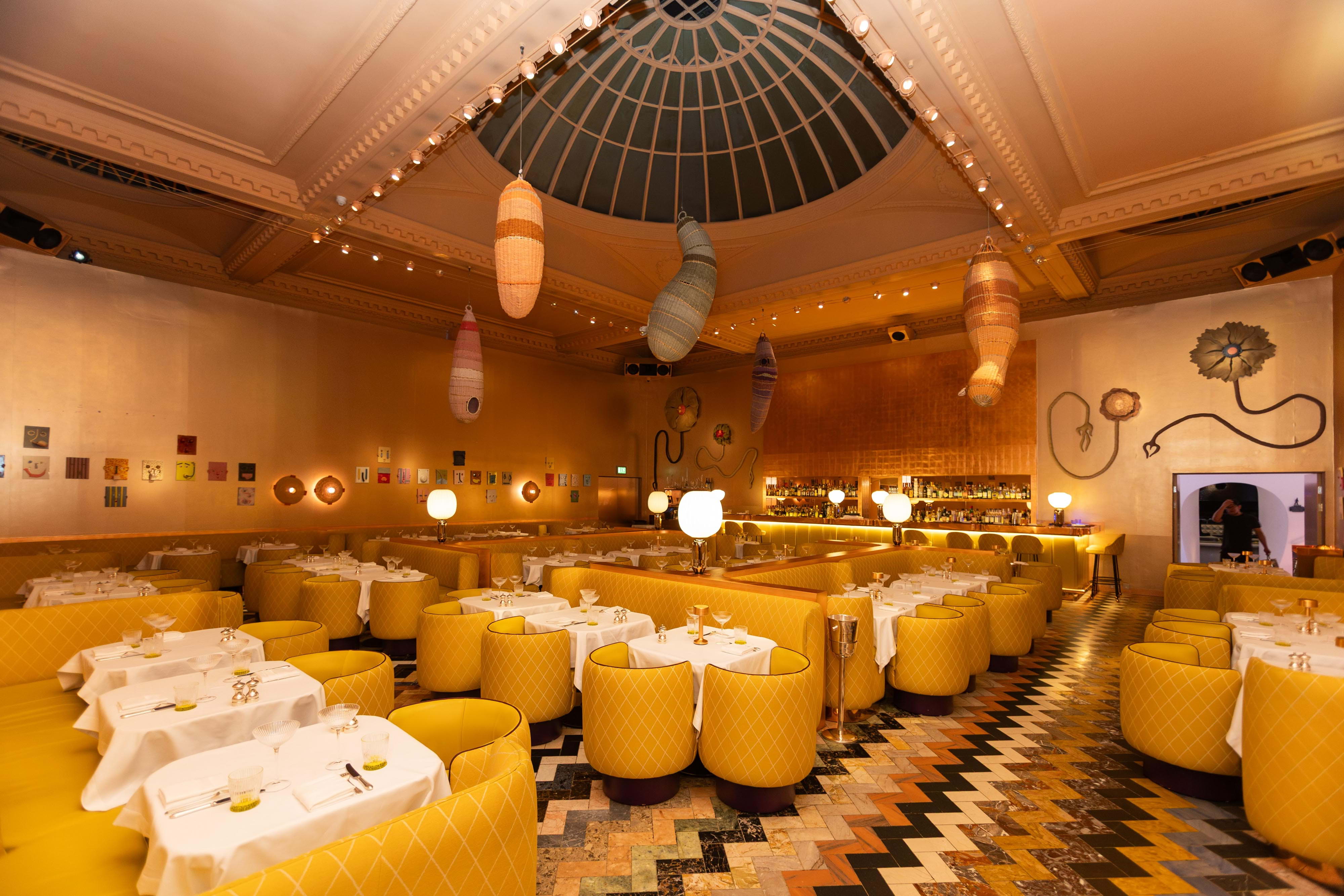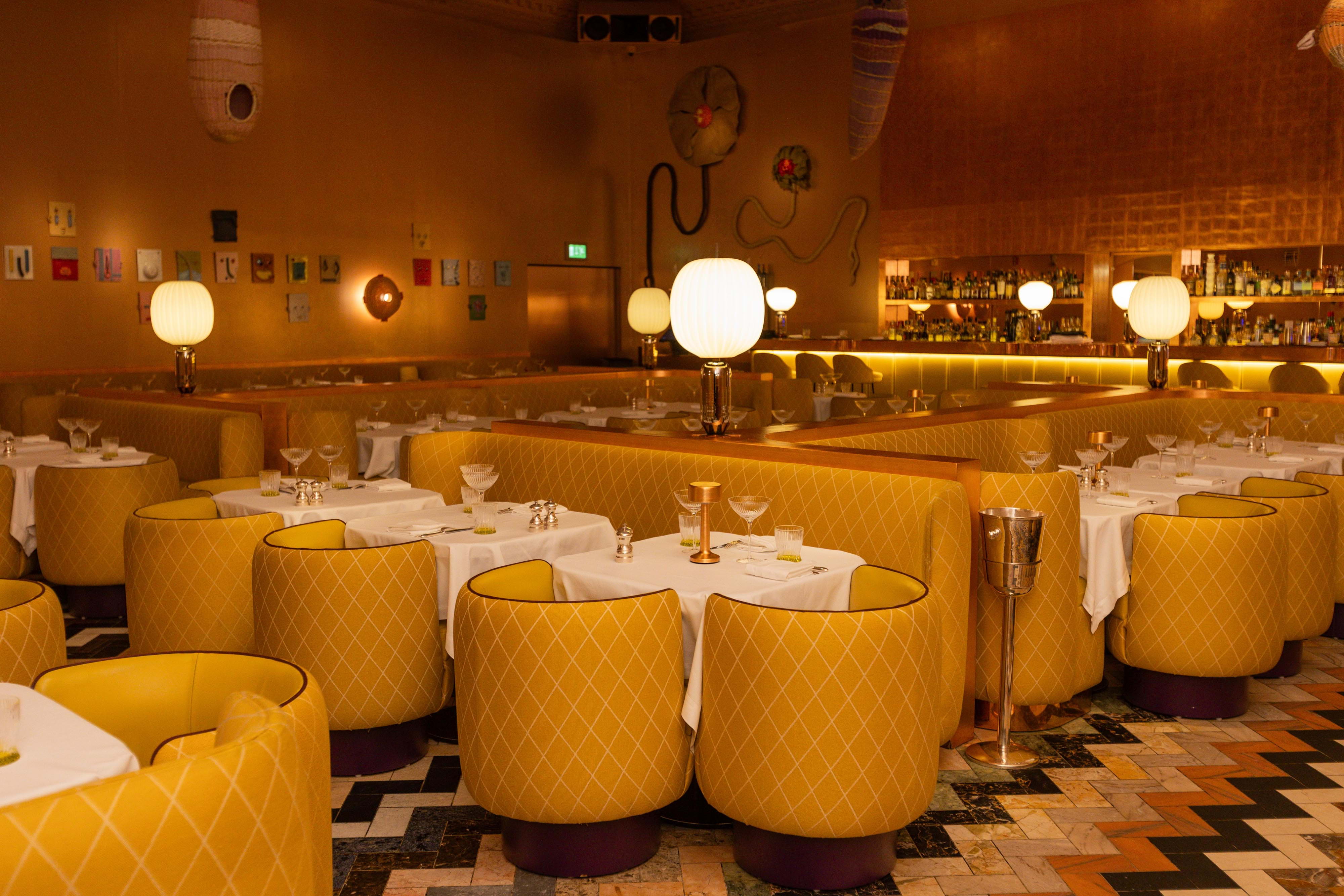Once famously pink, The Gallery has since been reimagined in a luminous yellow Art Deco style with a Twin-Peaks-esque tiled floor. In line with Sketch's overarching ethos of functioning as an evolving art space as much as being a culinary destination, The Gallery currently showcases eye-catching sculptures by an acclaimed artist, further enhancing the cultured ambience.