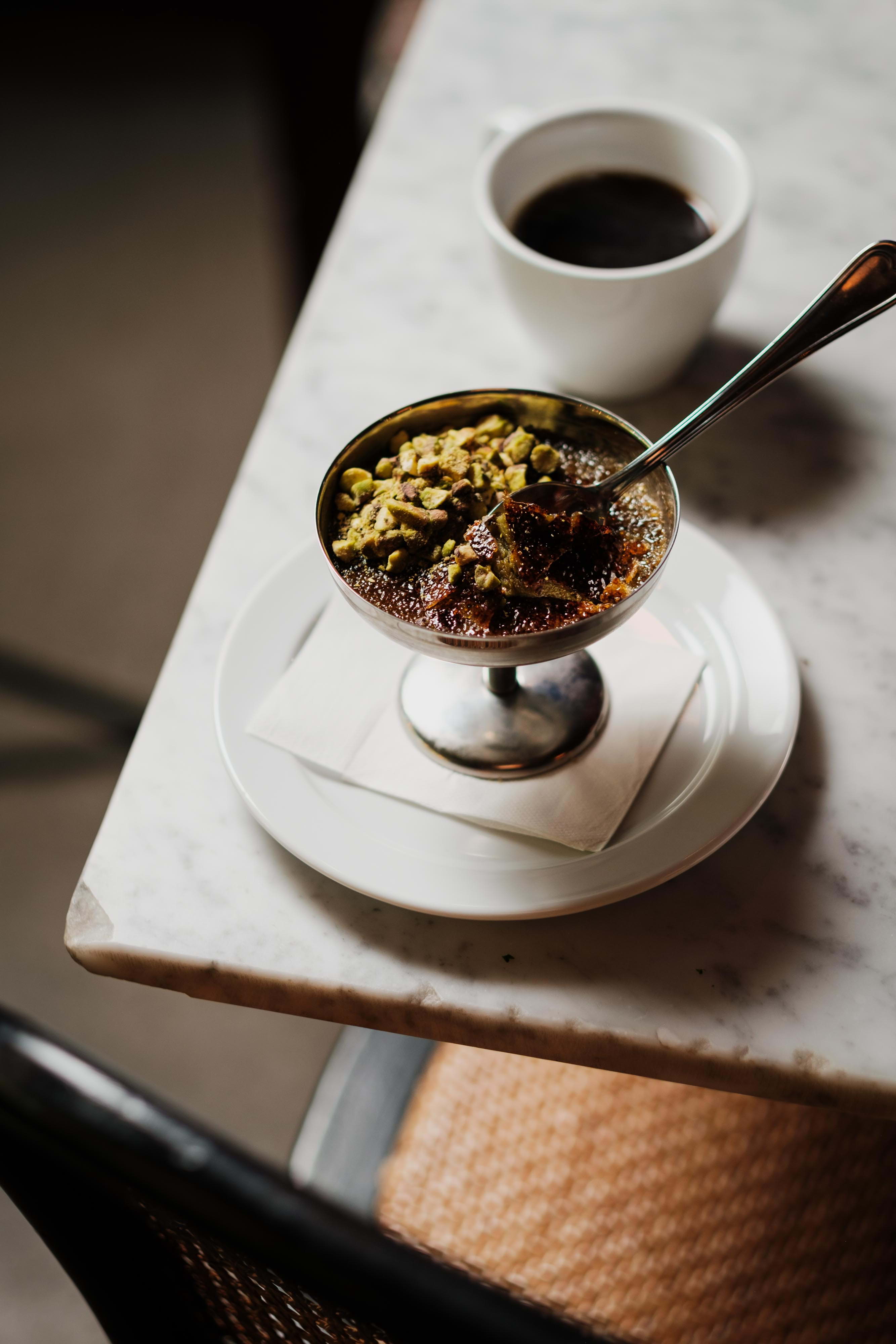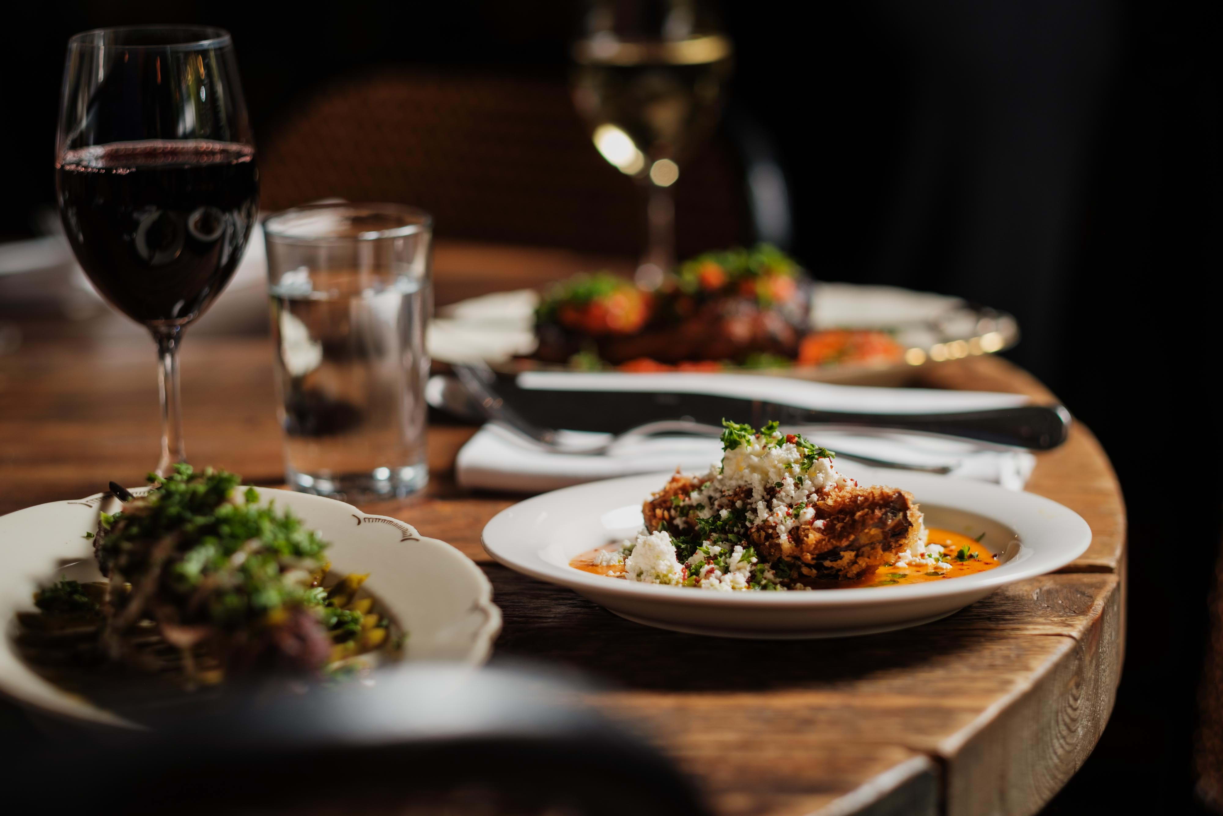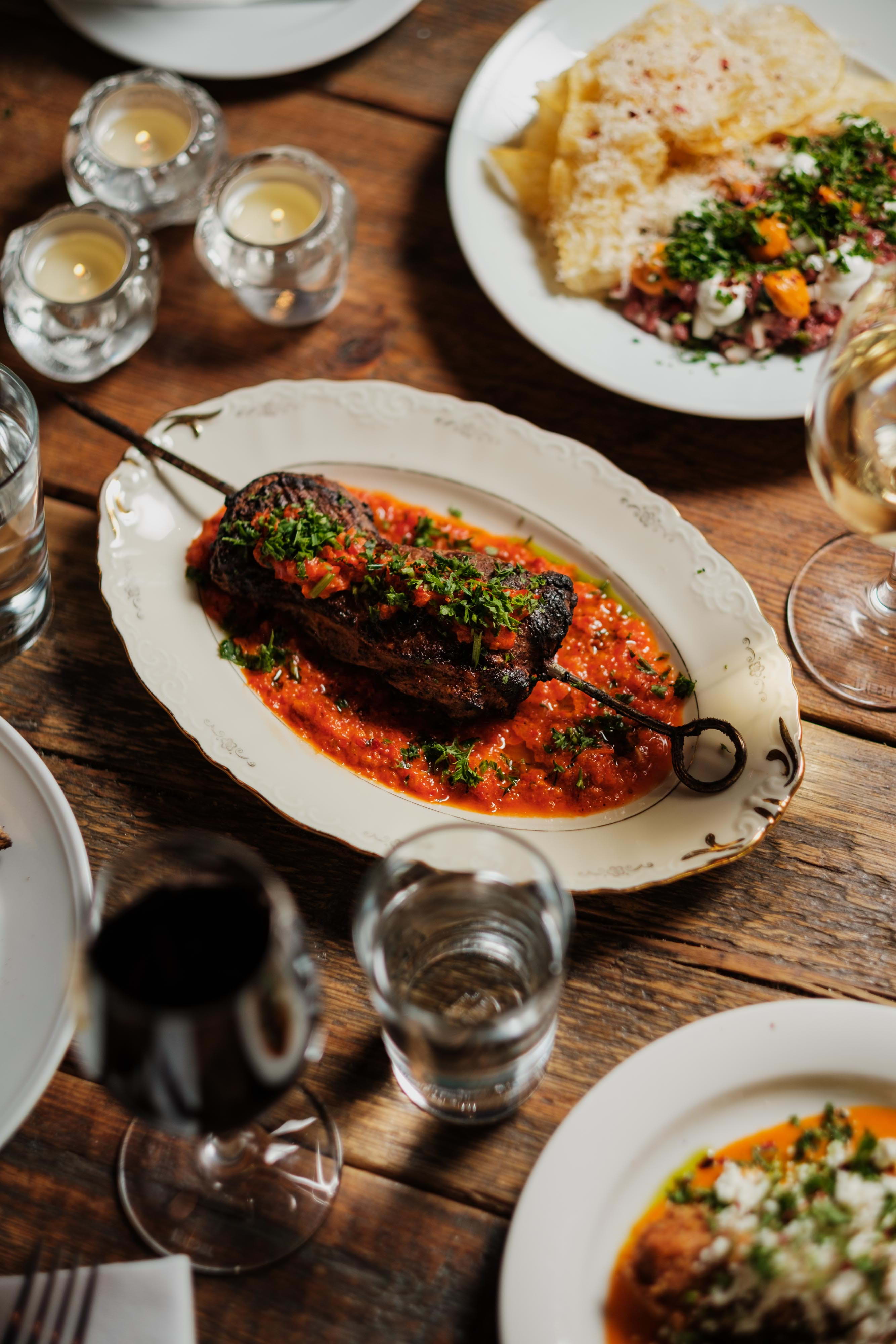 Helt fullt på uteserveringen, vi ville sitta inne och fick välja ett bord. Vi fick suverän service genom hela kvällen! Vi var tre och tog in alla mellanrätter att dela på. Innan åt vi en fräsch tallrik med ost och chark. Alla mellanrätter jättegoda förutom pommes kryddade med kanel som ingen av oss riktigt föll för. Kanelen kändes inte helt rätt för oss, men säkert gott för andra.