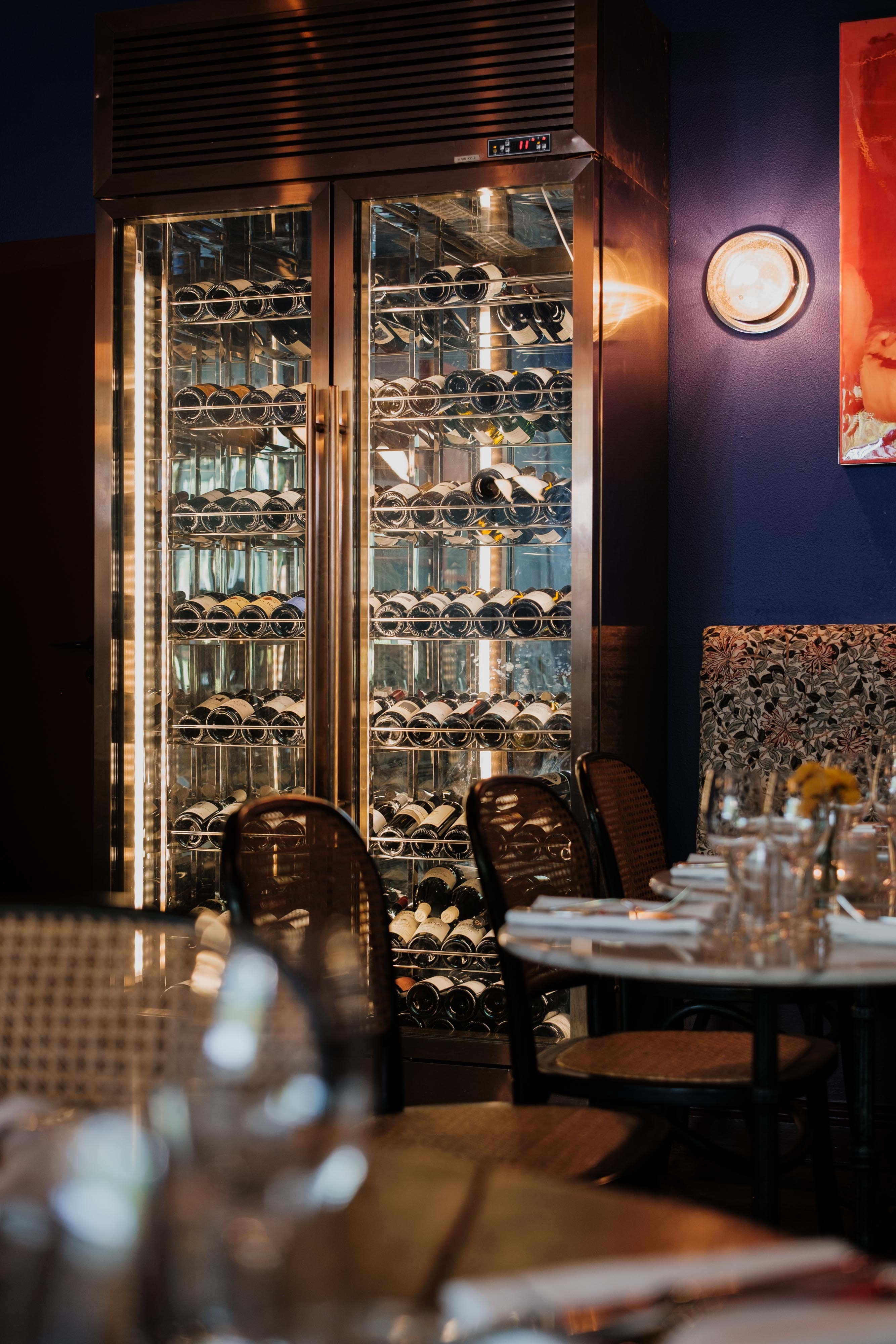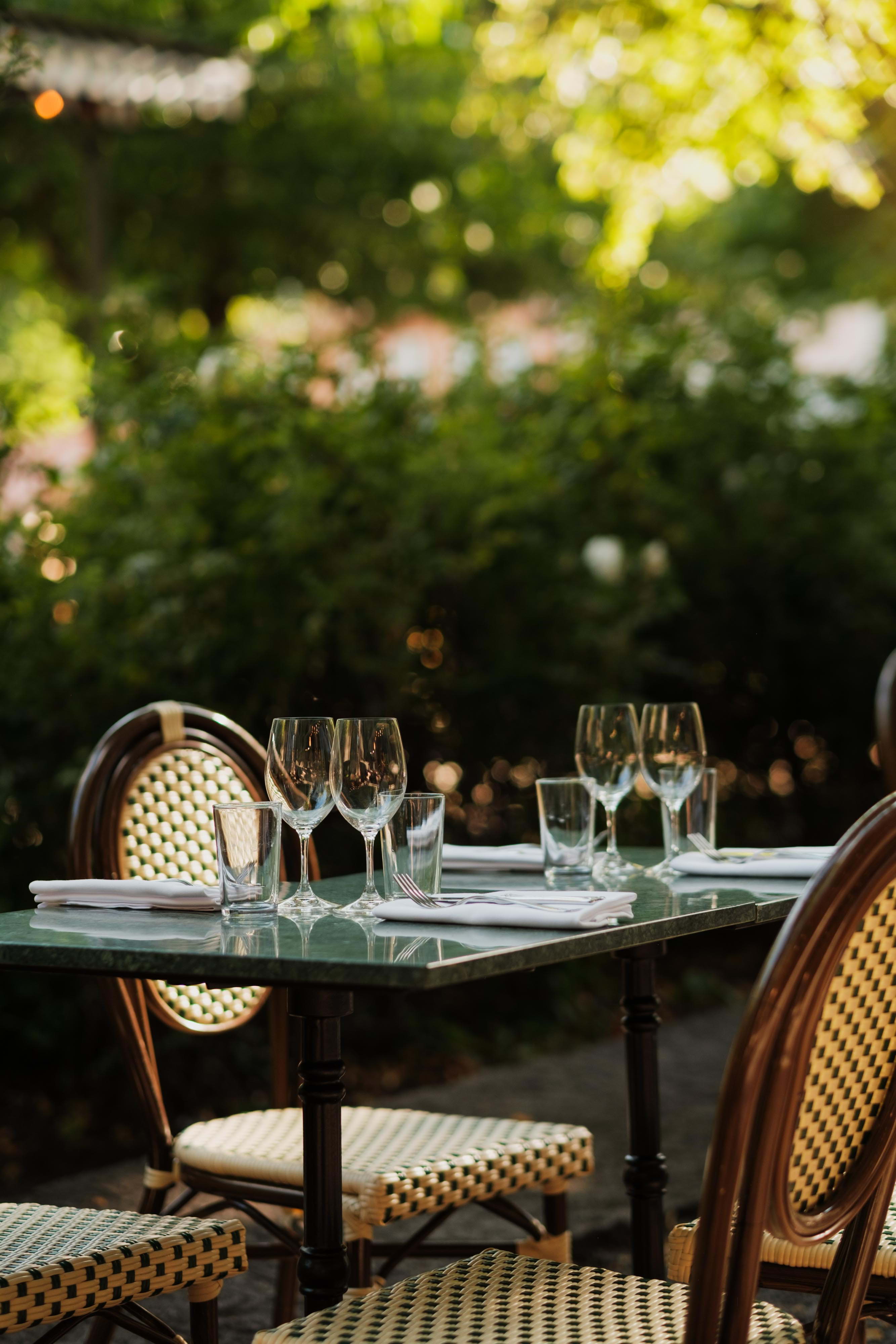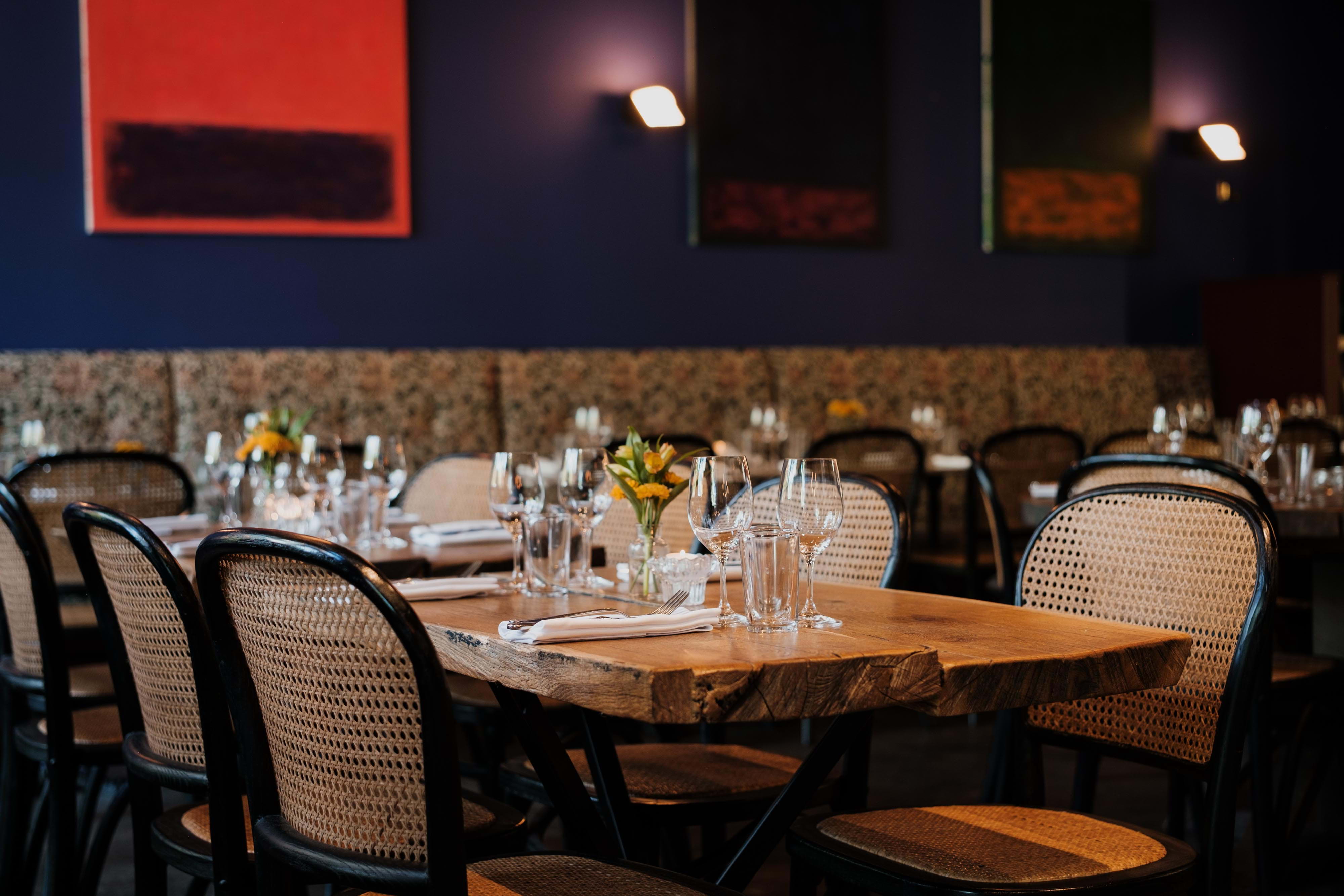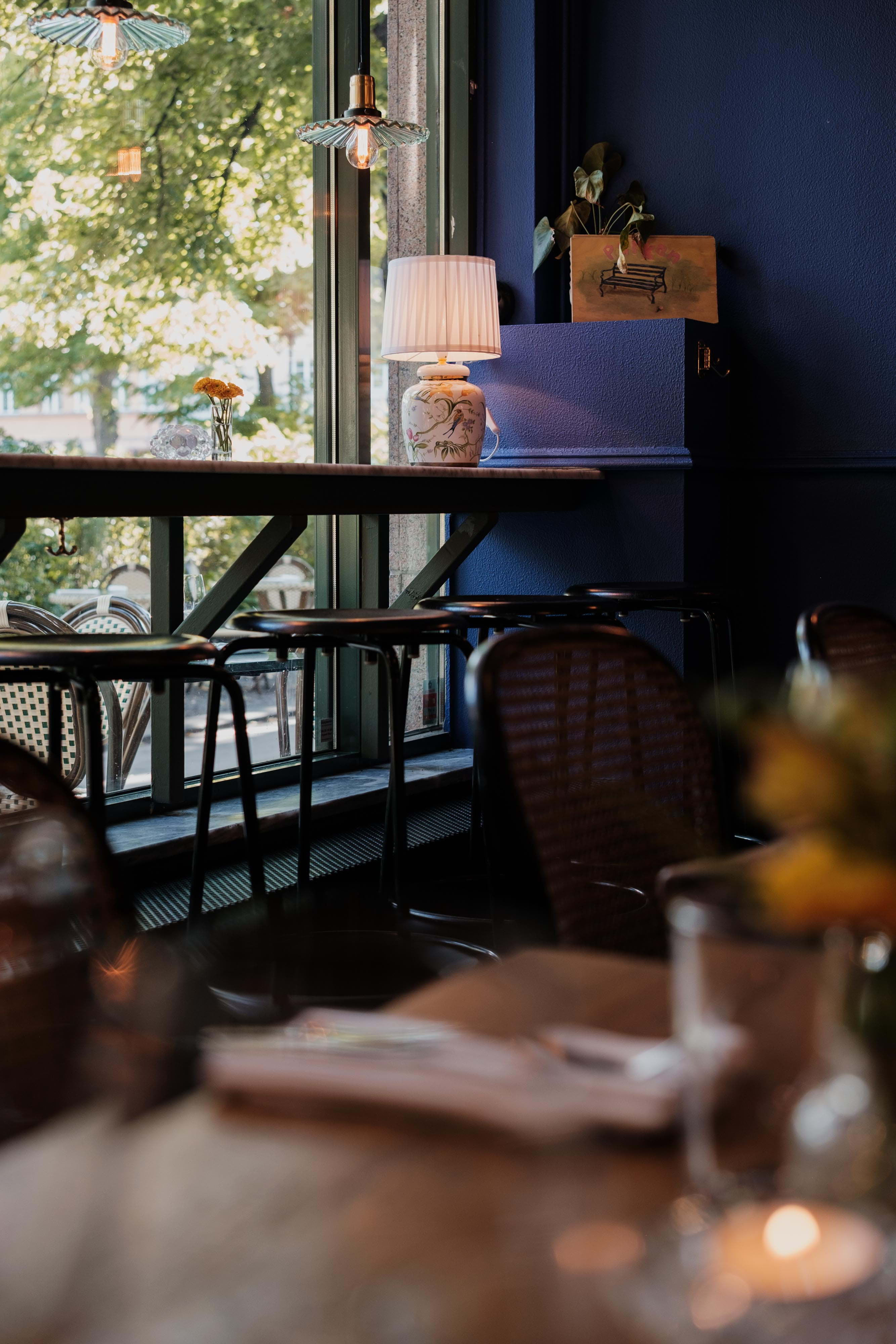 Inside the restaurant, bistro-style furniture combines with deep blue walls adorned with paintings from temporary exhibitions, which are changed at regular intervals. In the summer months, the large outdoor terrace offers both a sunny hangout and shady spots under the lush treetops.